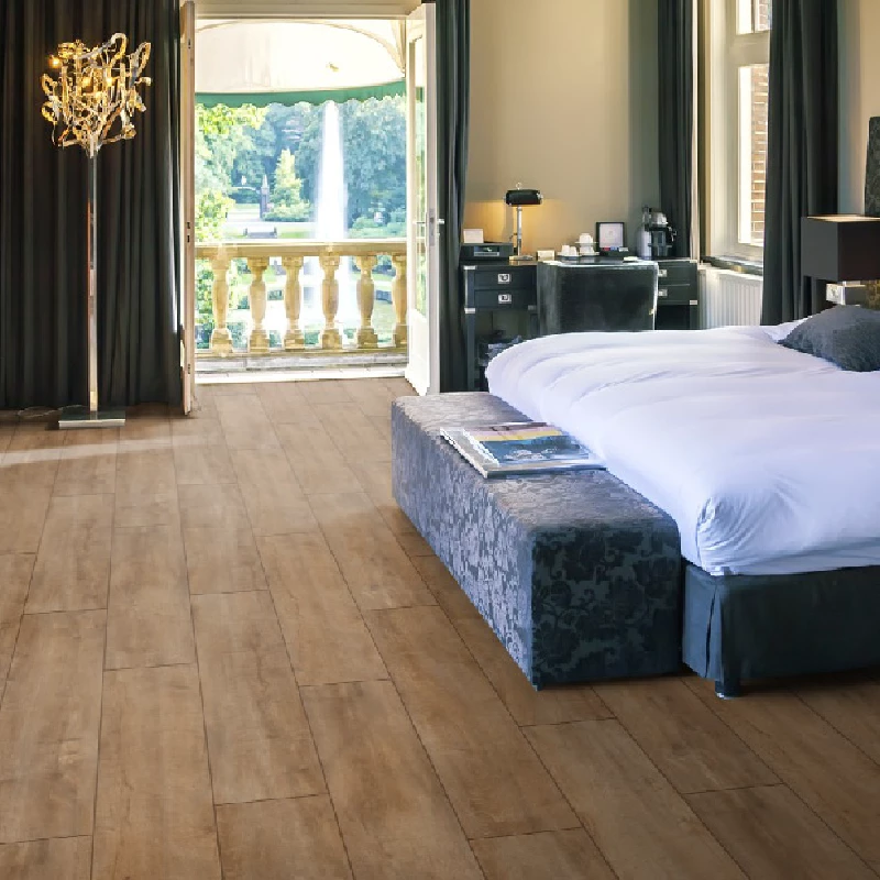 Chez Eden Parquets, les sols stratifiés de la gamme Exquisite Plus offrent l'apparence et le toucher du bois massif avec des panneaux extra-larges pour une ambiance plus élégante. Il présente une texture gaufrée et une finition mate de haute qualité. Classé AC4, il est très résistant pour un usage domestique intensif, et son système d'emboîtement 5G simplifie l'installation. Les planches ont des bords taillés à 45 degrés, créant une rainure en V lors de l'assemblage pour un aspect authentique du bois massif.