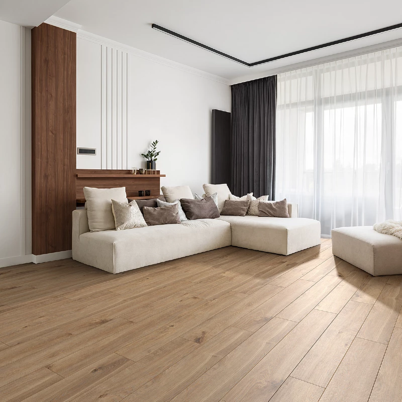 Eden Parquets propose le FAYOLA K405, un panneau de sol qui imite parfaitement une planche massive avec le motif du bois naturel - grains, nœuds, rainures et rugosités. Leur format standard permet de finir le sol dans différents intérieurs, quelles que soient leurs dimensions. Ils conviendront parfaitement au salon, à la chambre à coucher, ainsi qu'au couloir. Les panneaux en chêne FAYOLA K405 KRONOSTEP se distinguent par leur très grande résistance à l'abrasion, ce qui en fait un choix idéal pour les pièces à fort trafic, y compris les bâtiments publics. Grâce à un revêtement spécial antistatique qui empêche le dépôt de poussière, ils sont faciles à nettoyer.