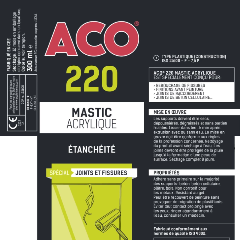 Le produit ACO 220 est spécialement conçu pour les professionnels afin de réaliser des joints d'étanchéité et de reboucher les fissures avec une qualité exceptionnelle. Grâce à sa remarquable élasticité et à son excellente adhérence chimique, il assure une longévité supérieure. Une fois sec, il est possible de le peindre.