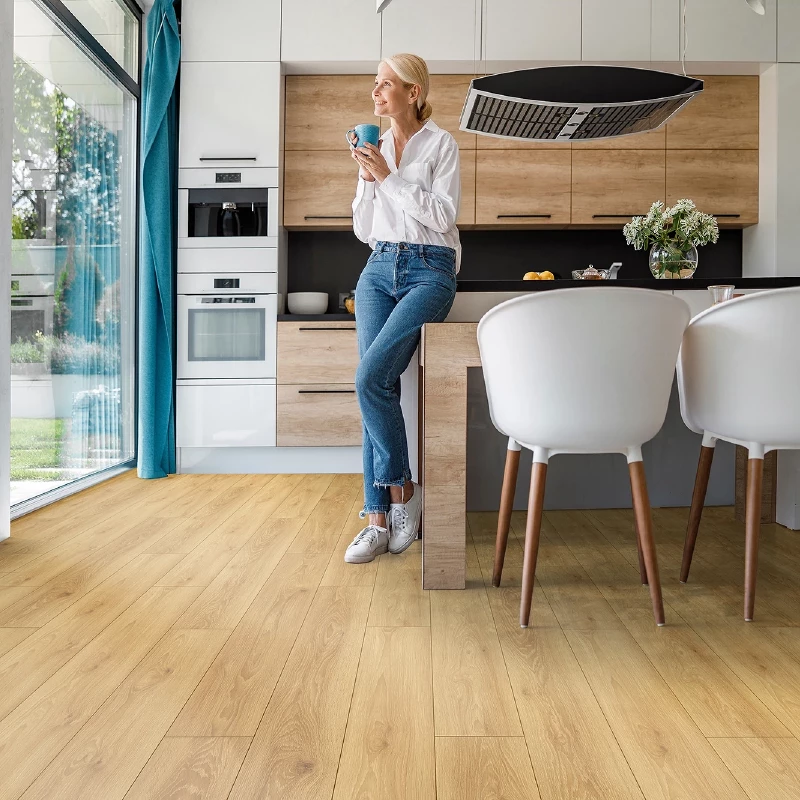 Eden Parquets propose le RYE SAVORY K627, un panneau de sol qui imite parfaitement une planche massive avec le motif du bois naturel - grains, nœuds, rainures et rugosités. Leur format standard permet de finir le sol dans différents intérieurs, quelles que soient leurs dimensions. Ils conviendront parfaitement au salon, à la chambre à coucher, ainsi qu'au couloir. Les panneaux en chêne RYE SAVORY K627 KRONOSTEP se distinguent par leur très grande résistance à l'abrasion, ce qui en fait un choix idéal pour les pièces à fort trafic, y compris les bâtiments publics. Grâce à un revêtement spécial antistatique qui empêche le dépôt de poussière, ils sont faciles à nettoyer.