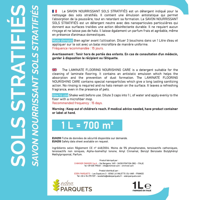 Le Savon Nourrissant Sols Stratifiés est spécialement conçu pour le nettoyage des revêtements de sol en stratifiés. Sa formule en émulsion antistatique facilite l'absorption de la poussière tout en prévenant son accumulation. De plus, ce savon intègre des nanoparticules spéciales qui assurent une action désinfectante durable sur les surfaces traitées, sans laisser de résidu ni nécessiter de rinçage. Même en présence d'animaux domestiques, il laisse un agréable parfum frais dans votre espace.