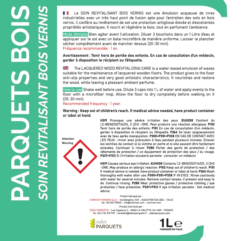 Le Soin Revitalisant Bois Vernis est une émulsion aqueuse composée de cires industrielles à un point de fusion très élevé, spécialement formulée pour l'entretien des surfaces en bois vernis. Il offre une protection antidérapante efficace ainsi que d'excellentes propriétés antistatiques pour votre sol. En plus de cela, il nourrit et régénère le bois tout en laissant un agréable parfum dans l'environnement.