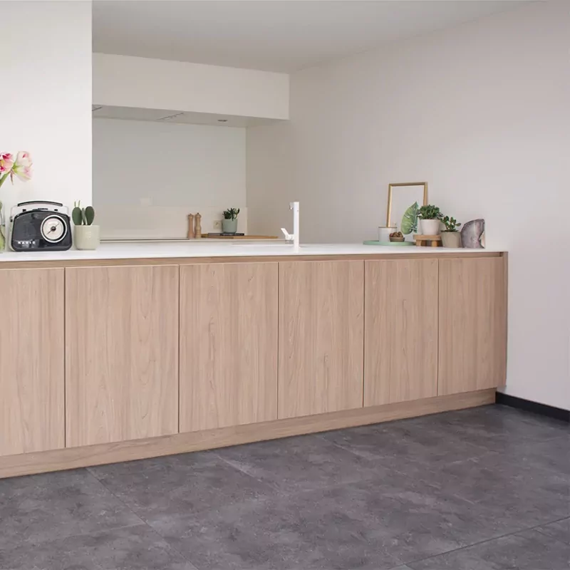 Les dalles vinyles Basalt offrent une esthétique béton moderne qui s’impose comme un choix tendance pour les intérieurs contemporains. Leur format 615 × 615 mm apporte un rendu structuré et épuré, idéal pour créer une atmosphère minimaliste ou industrielle.